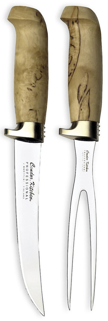 Paistiveitsen pitkällä ja kaareutuvalla terällä siivutat kevyesti, ja paistihaarukalla pidät paistin kätevästi paikoillaan. Suomalaisesta visakoivusta valmistettujen kahvojen kaareutuvat perät ja aterimien sormisuojahelat varmistavat pitävän otteen.