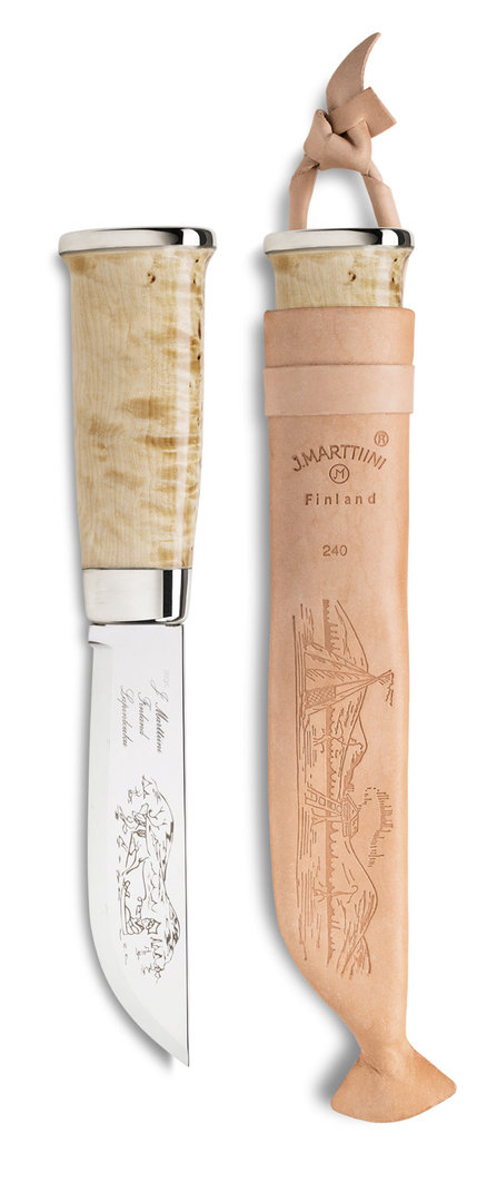 Ruostumattomassa kromiterästerässä on kaunis Lappi-aiheinen etsaus. Myös tupessa on kaunis kuviointi.