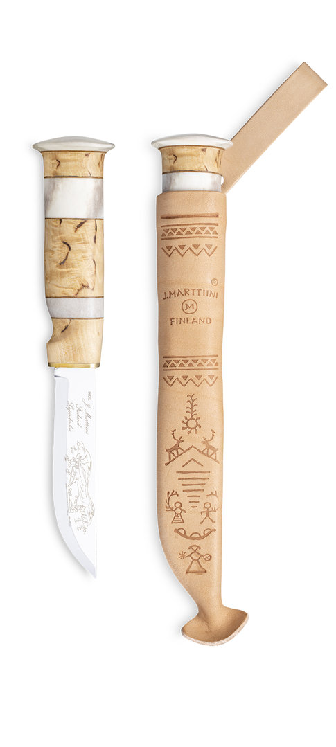 Tämän perinteisen leukun kahvassa visakoivu yhdistyy upeasti poronsarviluuhun. Leukun ruostumattomassa kromiterästerässä on kaunis Lappi-aiheinen etsaus. Myös nahkatuppeen on ikuistettu perinteisiä arktisia kuviointeja.