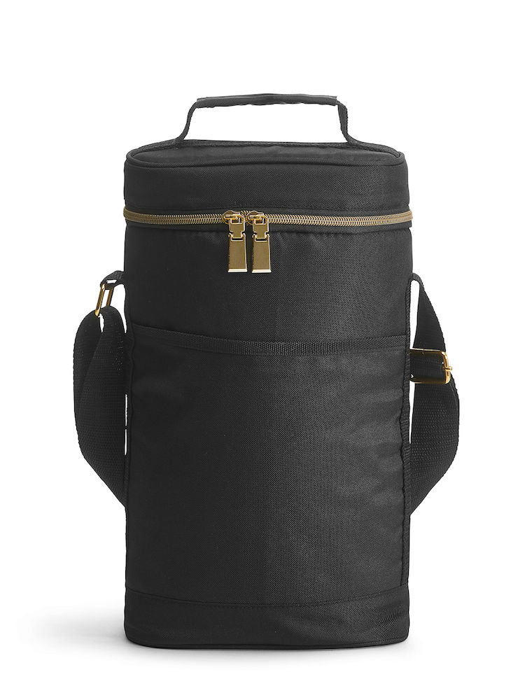 Kätevä ja tyylikäs musta kylmälaukku, jossa on upeita kullanvärisiä detaljeja. Sopii kahdelle viinipullolle tai kahdelle 1,5 litran PET-pullolle.