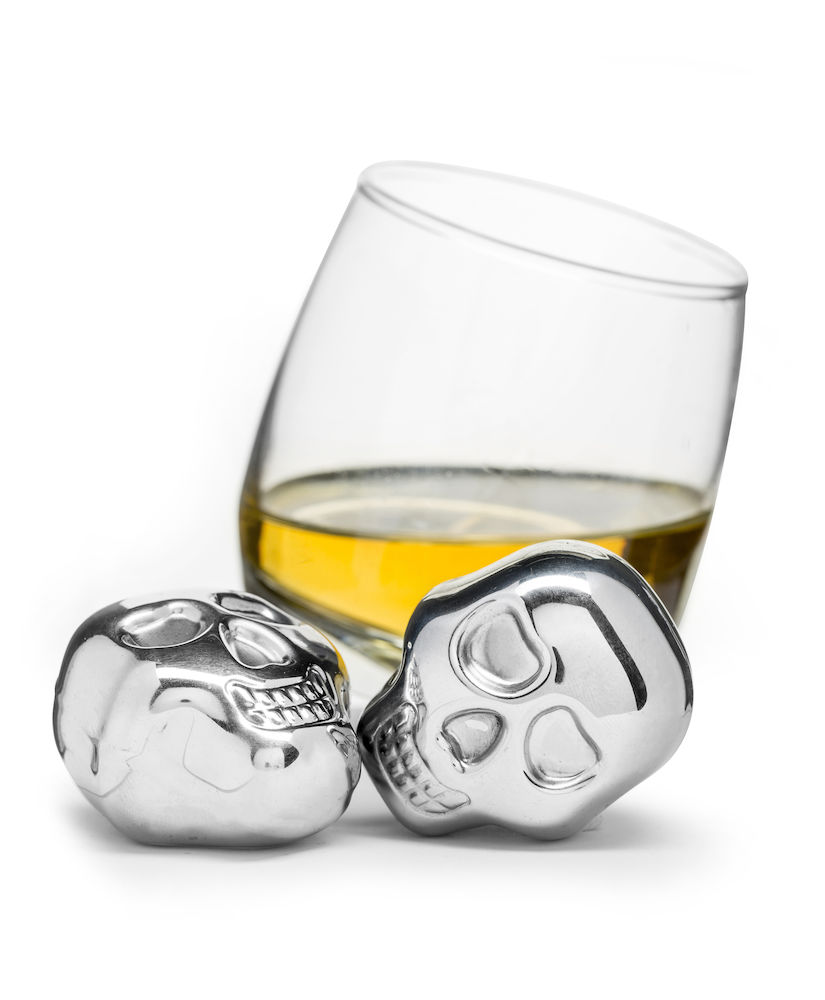 Kaksi kallon muotoista teräsjääpalaa. Laita teräsjääpalat pakastimeen 2 tuntia ennen käyttöä. Nämä jääpalat eivät sula ja laimenna juomasi makua. Hauska lahja! Mukana myös juomareseptivihko.