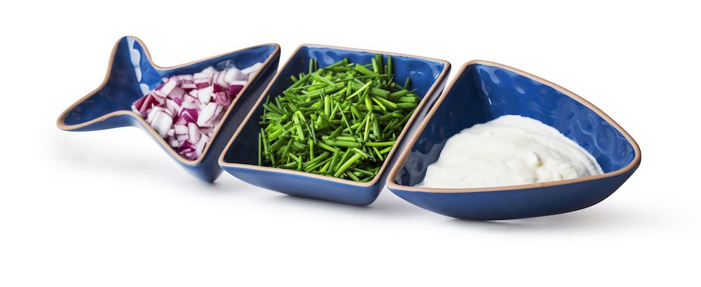 Kolme tarjoilukulhoa muodostavat yhdessä kalan. Kattausta piristävä sisustusyksityiskohta ja hauska lahjaesine.