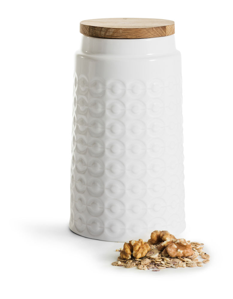 Oak säilytyspurkki, iso Käytännöllisiä kivitavarapurkkeja somistaa klassinen reliefikuvio. Tiivis tammikansi.