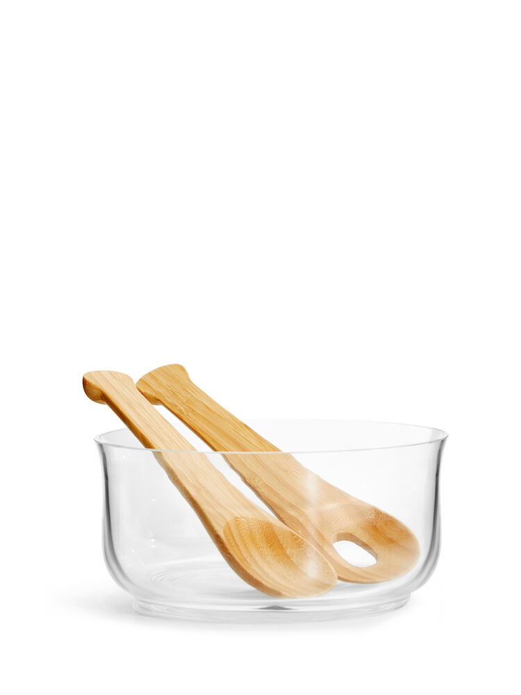 Tyylikäs salaattikulho lasia ja salaattiottimet bambua. Mainio lahja!