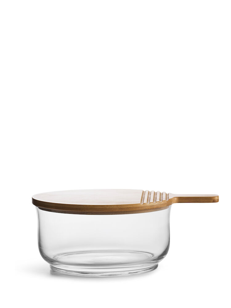 Monikäyttöinen setti lasia ja bambua. Bambuosa toimii kantena, leikkuulautana ja tarjottimena. Voit tarjoilla reilunkokoisesta lasikulhosta esimerkiksi salaattia, peittää kulhon bambukannella ja laittaa mahdolliset tähteet jääkaappiin. Bambulla on monia hyviä ominaisuuksia. Se on mm. luonnollisen antibakteerista ja muuntaa lisäksi kasvuaikanaan hiilidioksidia hapeksi monia muita kasveja tehokkaammin.