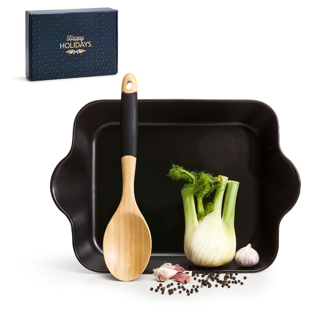 Trendikäs, mattamusta, iso uunivuoka jonka mukana myös bambuinen tarjoilulusikka, reseptejä sekä inspiroivia kuvia. Kaikki yhdessä lahjapaketissa. Täydellinen lahja!