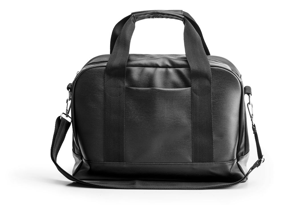 Tyylikäs tietokonelaukku mustasta tekonahasta. Taskuja laukun sisä- ja ulkopuolella. Laukun avulla matkustamisesta tulee helppoa ja kätevää takana olevan hihnan ansiosta, jonka saa kiinnitettyä matkalaukkujen kahvaan. Sisältää olkahihnan. Tilavuus 13 litraa.