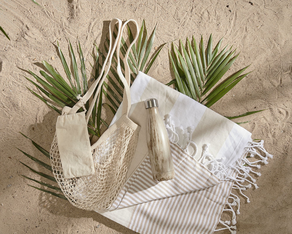 Mainio kesäinen lahjaidea ja perussetti lomanviettoon. 100 % puuvillasta valmistettu verkkokassi. Teräksinen termospullo, joka pitää juoman kylmänä 24 tuntia ja kuumana 12 tuntia. Ohut kudottu hamam-pyyhe, joka sopii erinomaisesti rantapyyhkeeksi. Kaikissa tuotteissa on sama värimaailma.