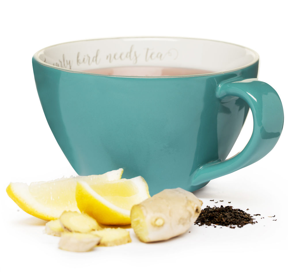Teemuki, turkoosi Turkoosi teemuki; sisäpuolelle painettu teksti "The early bird needs tea". Hurmaava!