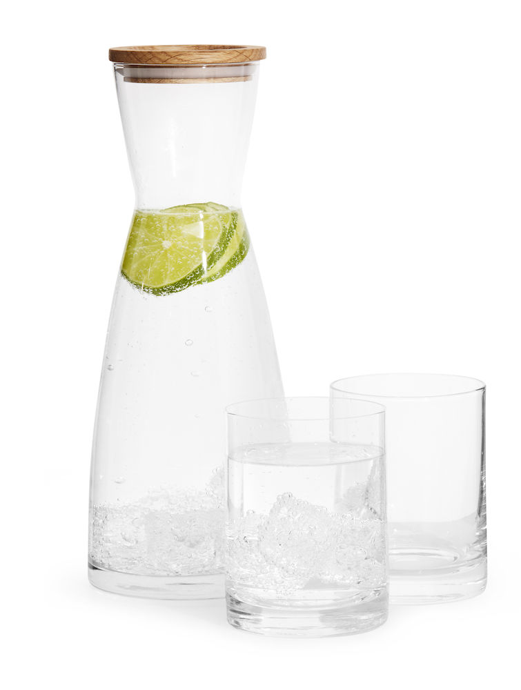 Vesikarahvi & kaksi lasia Karahvi bambukorkilla. Korkissa on silikoninen tiiviste. Näyttävästi pakattu lahjapakettiin kahden lasin kanssa. Täydellinen lahja!