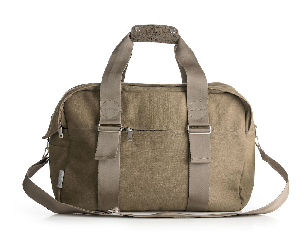 Tilava beige viikonloppulaukku hienoa kivipestyä canvasta. Taskuja ulko- ja sisäpuolella. Tässä laukussa tavarat pysyvät hyvässä järjestyksessä. Sisältää olkahihnan. Tilavuus 26 litraa.