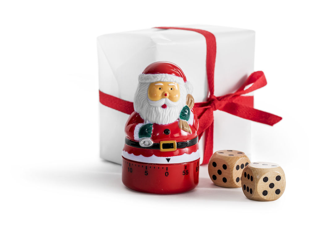 Arpakuutio, ajanottokello ja ohjeet joululahjapelin pelaamiseen sukulaisten tai ystävien kanssa.