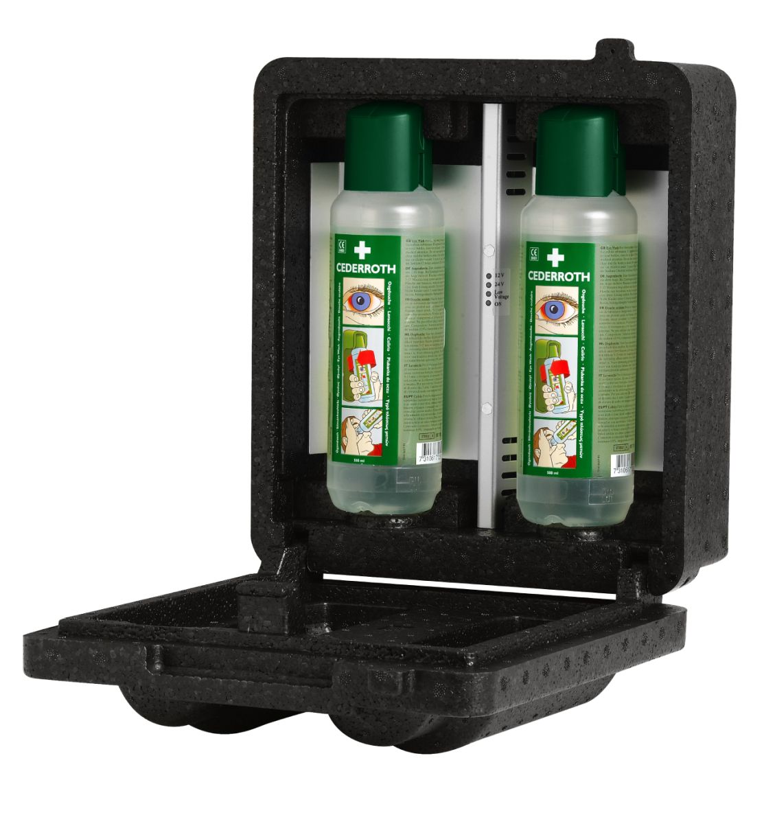 Kylmissä olosuhteissa lämpökaapissa voi säilyttää kahta Cederrothin Silmänhuuhtelupulloa. Lämpötilan ollessa -20°C ja +20°C, kaappi pitää silmänhuuhteluaineen +20°C (±2°C) asteisena. Kaappi on valmistettu lämpöä eristävästä polypropyleenistä (EPP) ja siinä on termostaatilla varustettu alumiininen lämmityselementti. Toimii automaattisesti sekä 12V että 24V jännitteillä ilman lisätarvikkeita. Jos kaappi jätetään päälle pidemmäksi aikaa, esim. pysäköityyn autoon, kaapissa on jännitteentunnistin, joka kytkee automaattisesti lämpökaapin pois päältä mikäli sähköjärjestelmän jännite laskee alle ennalta asetetun arvon.