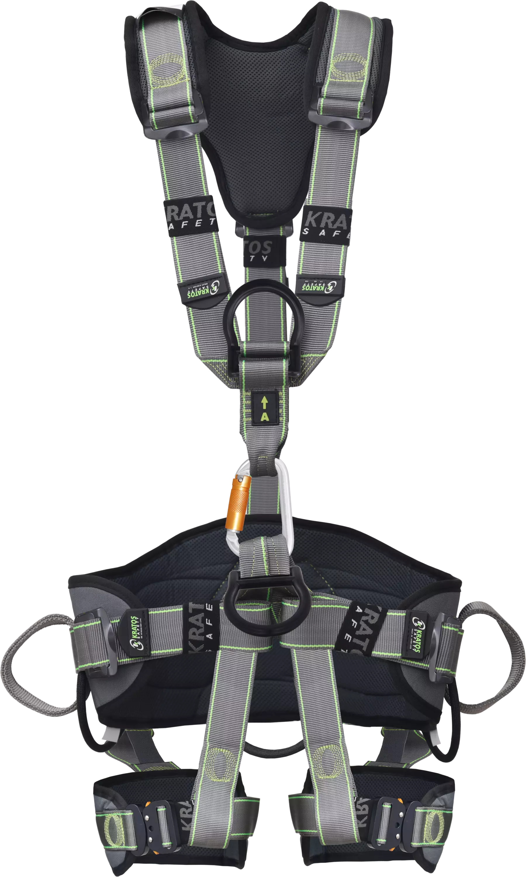 Attachment points - 1 textile dorsal D-ring (A) and 1 sternal attachment (A) for fall arrest system, 1 ventral attachment for rope access, and 2 lateral textile D-rings for work positioning.