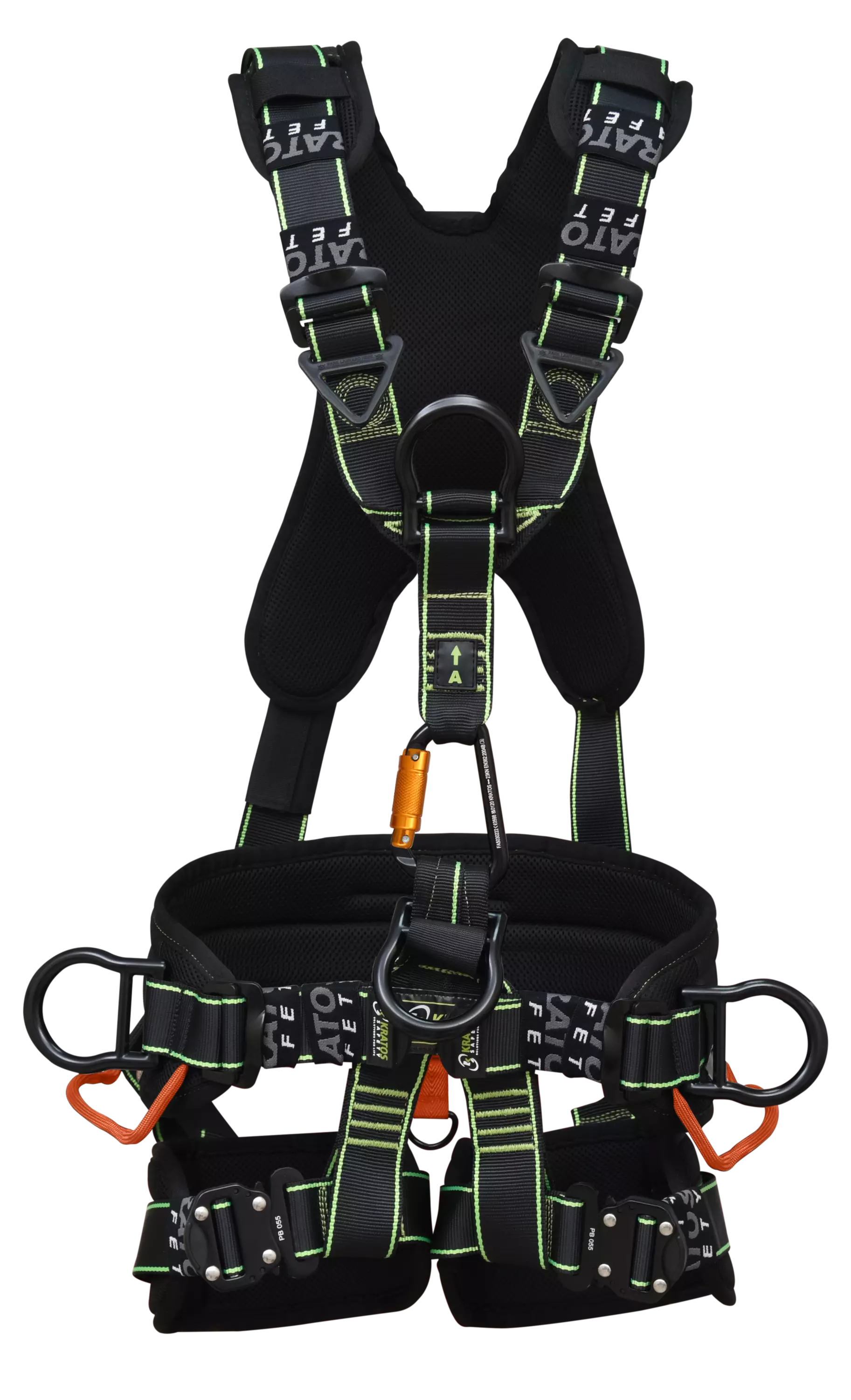 Attachment Elements - 1 Dorsal & 1 Sternal D-Ring for Fall Arrest, 1 Ventral D-Ring at waist level in front for Rope Access & 2 lateral D-Rings at waist level on the sides for Work Positioning.