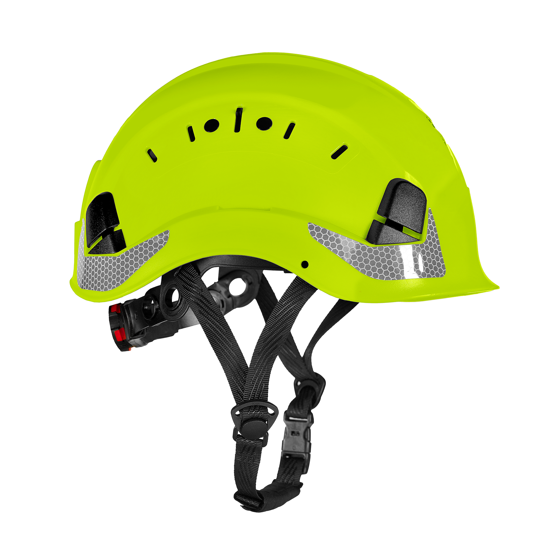 Suojakypärä säädettävillä tuuletusaukoilla ja säädettävällä pehmustetulla 4-piste leukahihnalla.