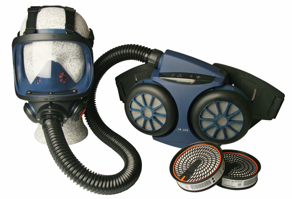PAPR moottoroitu hengityssuojain valmispakkaus toimitetaan seuraavasti: SR 500 Puhallin, Suodatinadapteri, 2 kpl P3 hiukkassuodatin, 2 kpl Esisuodatin, 5 kpl Esisuodattimen pidin. Latauslaite....