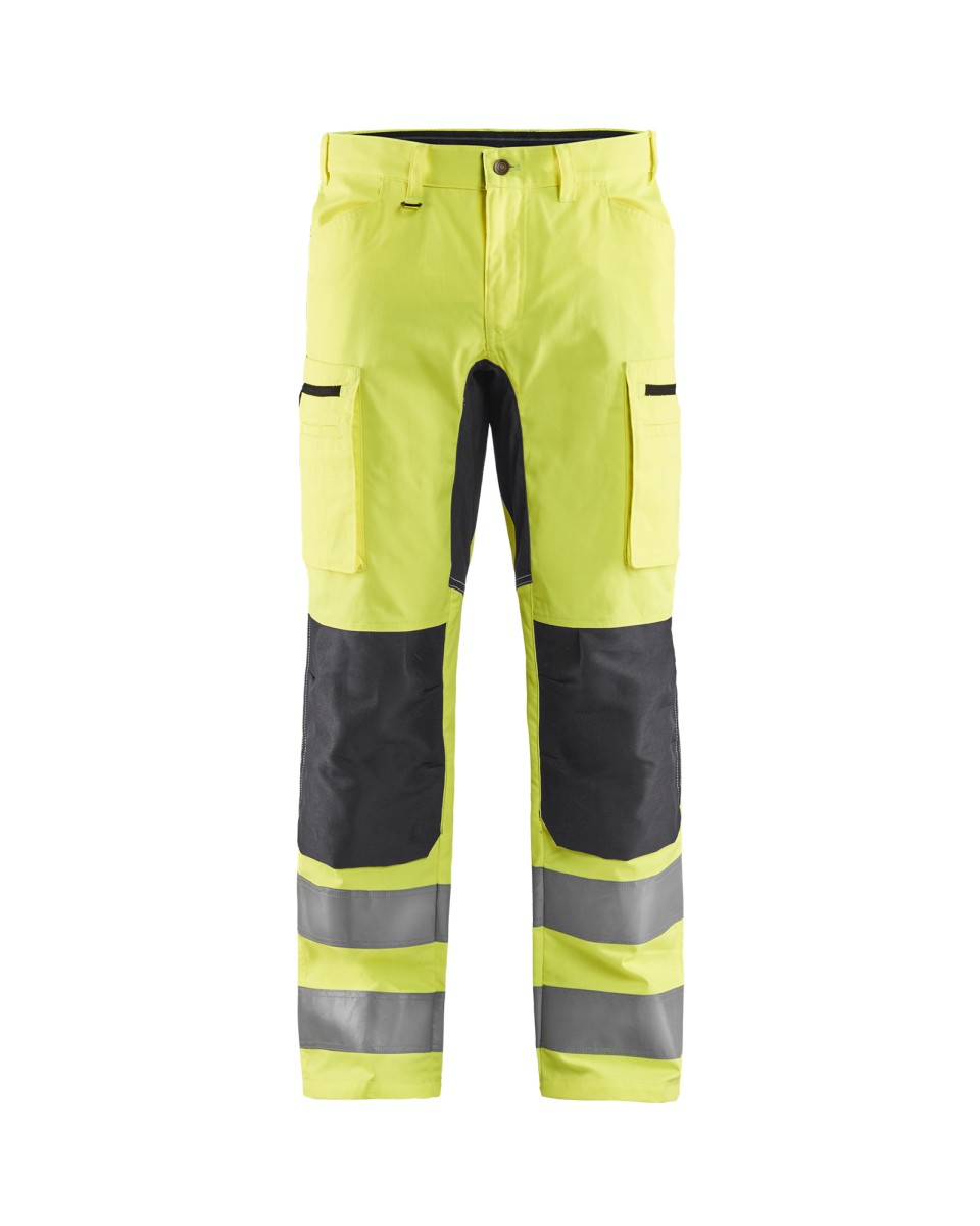 Joustavat highvis housut joustavilla osioilla haaroissa ja takana. CORDURA® Stretch polvisuojataskut lisäävät mukavuutta. Muotoillut polvet lisäävät mukavuutta ja liikkuvuutta. Sertifioitu EN ISO 20471 luokka 2.