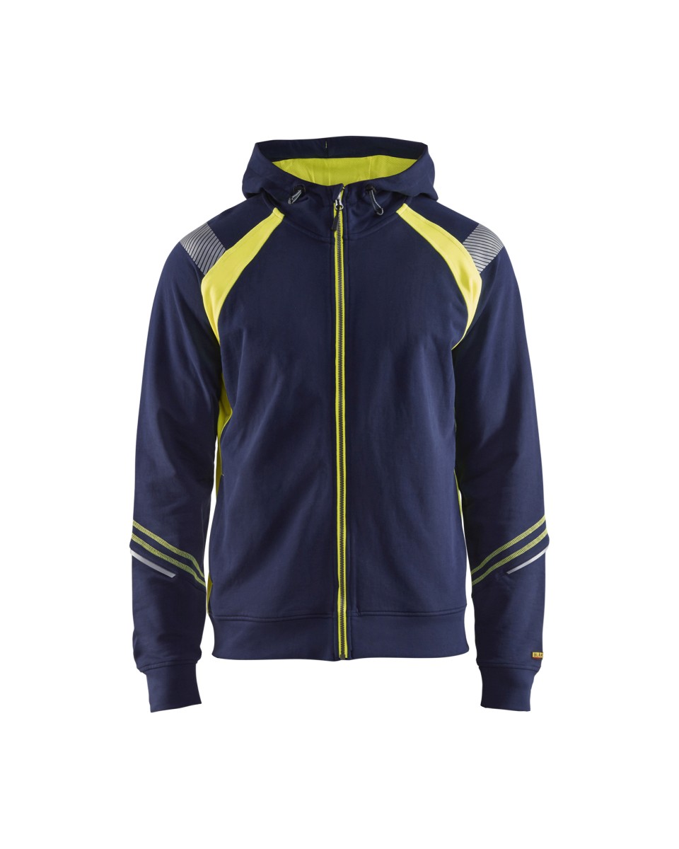 Pehmeä ja mukava huppari, jossa tummat alueet on 100% puuvilla ja heijastavat alueet 100% polyesteriä. Katkonaiset heijastimet ja heijastavat yksityiskohdat lisäävät näkyvyyttä. Resorit alahelmassa ja hihansuissa sekä vetoketjullinen puhelintasku sisäpuolella.