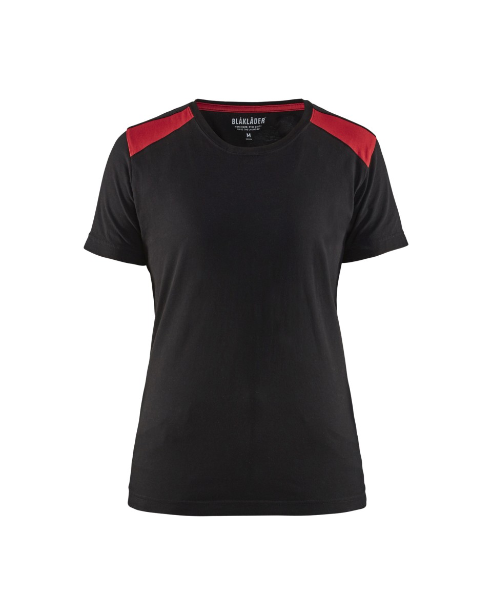 Kaksivärinen naisten t-paita. Vahvistetut niska- ja hartiasaumat ja kaarrokkeet olkapäillä. Sopii hyvin teollisuusmallistomme muihin vaatteisiin.