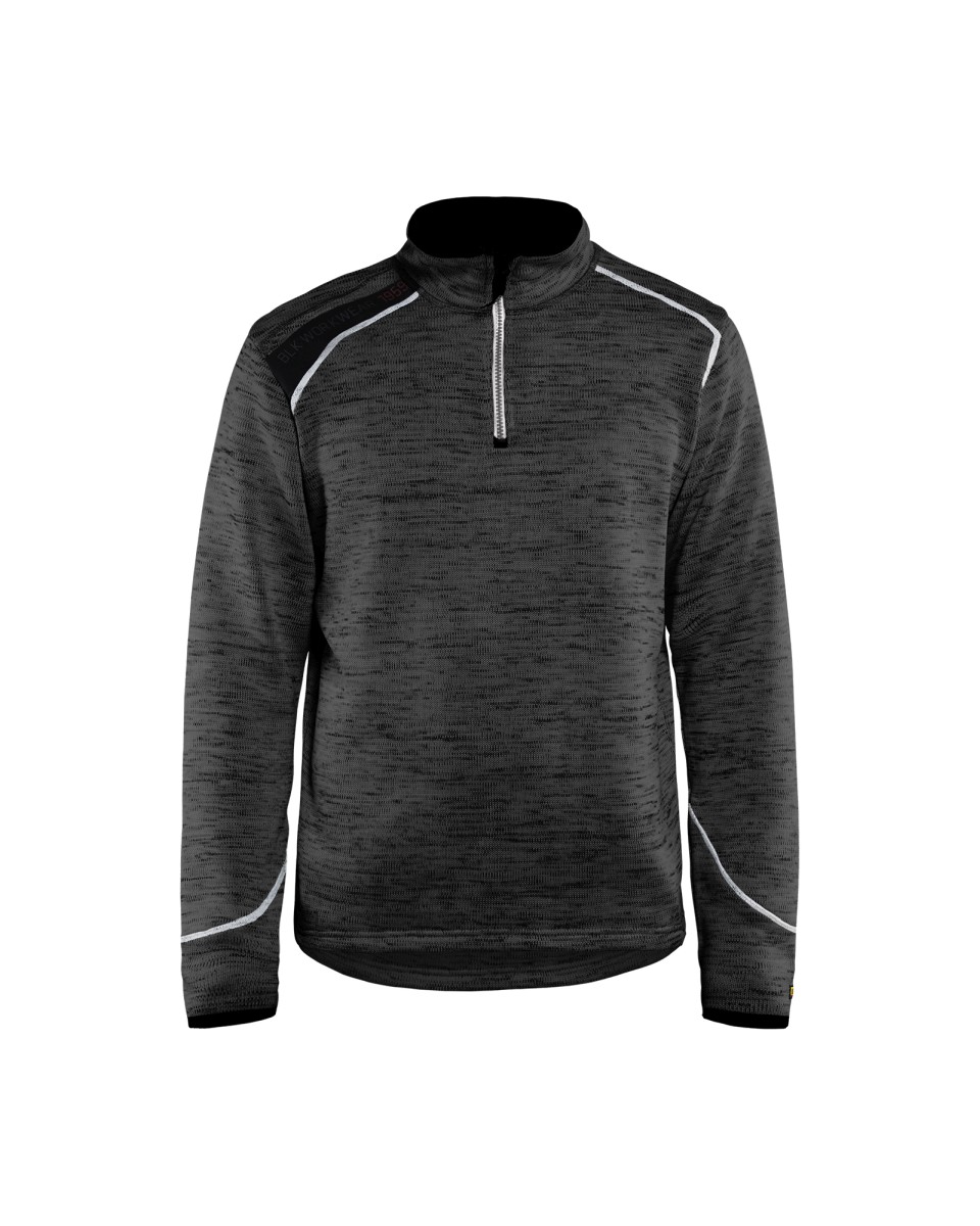 Neulottu pusero lyhyellä vetoketjulla ja korkealla kauluksella. Joustavat resorit hihoissa, pidennetty selkäosa ja fleecellä vuorattu kaulus.