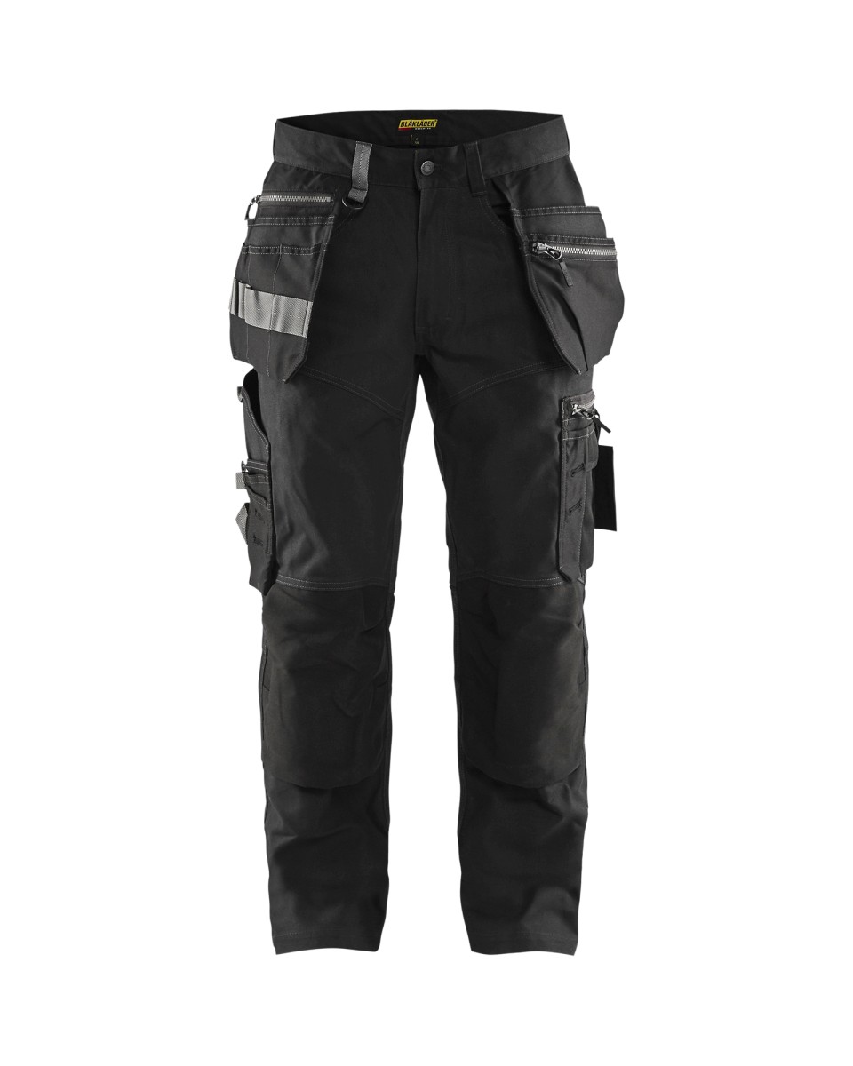 Toiminnalliset ja mukavat riipputaskuhousut canvas-kankaalla, joka on kestävää, mutta myös pehmeää ja hengittävää. Stretch kangas takana vyötäröllä ja etutaskuissa sekä CORDURA®-stretch polvisuojataskut lisäävät mukavuutta ja kestävyyttä. Useita toiminnallisia taskuja kuten riipputaskut vetoketjullisilla lisätaskuilla, kaksi paljetakataskua, vahvistettu mittatasku, kynätasku ja puukonpidike sekä helppokäyttöinen, joustava puhelintasku, johon sopii useimmat puhelimet. Mustia heijastavia yksityiskohtia pohkeissa.