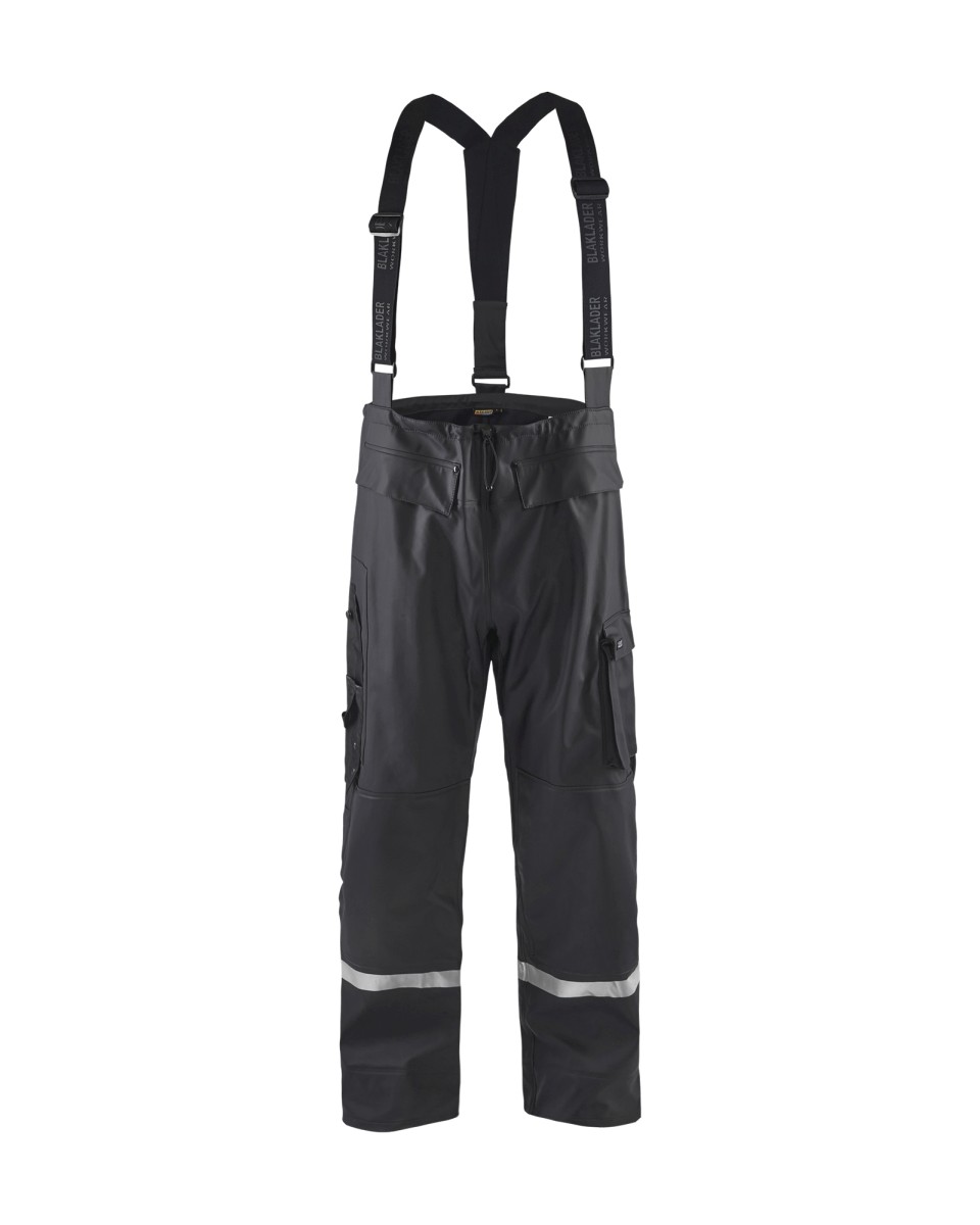 Sadehousut huomiovärillä työtehtäviin, jotka vaativat kestäviä, mutta myös liikkumisen mahdollistavia sadevaatteita. Tuulen- ja vedenpitävä, liimatut saumat. Hyvä istuvuus, leveä joustava resori vyötärössä takana, säädettävät ja irrotettavat joustavat henkselit ja säädettävät lahkeensuut napeilla. Helppokäyttöiset taskut, kuten palkeellinen reisitasku läpällä, mittatasku lisätaskulla ja puukonpidike sekä läpän alla aukot, joista riipputaskut on mahdollista saada esiin. Housut on vahvistettu polvista ja lahkeensuiden takaosasta. Sertifioitu EN 343 (suojaus sateelta) ja EN ISO 20471, luokka 2 (näkyvä varoitusvaatetus ammattikäyttöön). Väri 4600, 9900 ei ole sertifioitu EN ISO 20471 mukaan. Värien 3300, 4600, 5300 ja 9900 mallit on päivitetty. Aikaisempaa mallia toimitetaan niin kauan kuin varastoa riittää. Päivitetty tuote väreissä 4600, 9900 katso malli 1305.