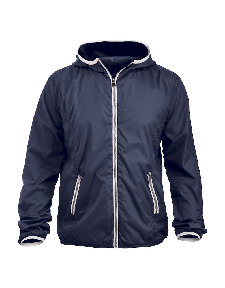 Kevyt, hupullinen tuulitakki. Sisävuori reikäkangasta. Kontrastitere hupussa ja hihansuissa. Malli sopii sekä miehille että naisille.