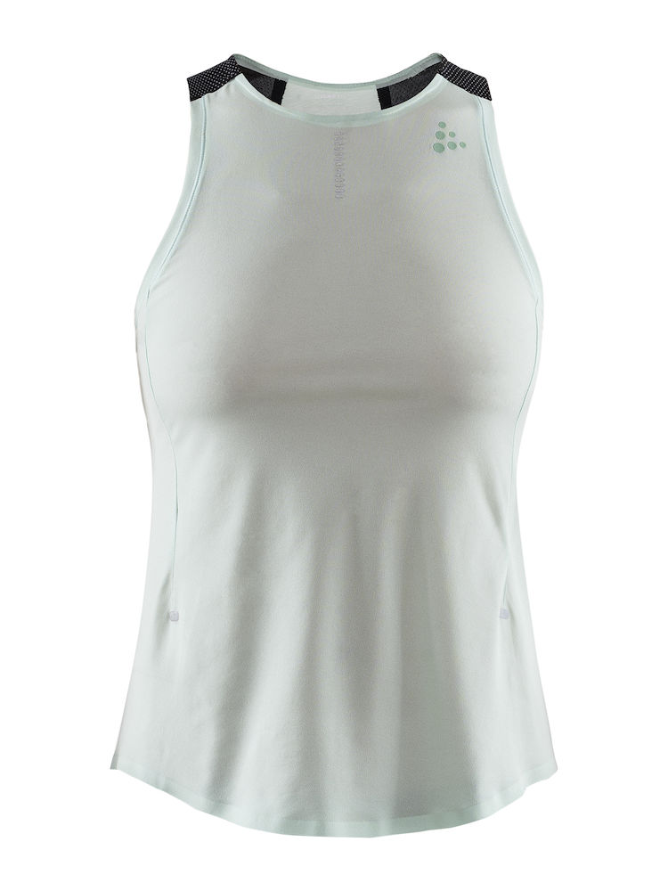 Superlight running singlet with racer back and glued hem at neck to avoid chafing.
