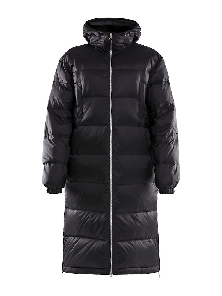 Oversized down coat with two way zipper at front and two side pockets.