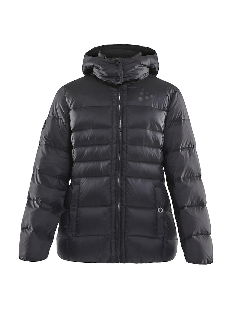 Naisten lämmin untuvatakki, jossa irrotettava huppu. Sivutaskut sekä povitasku sisäpuolella. • Vahvistetut saumat
