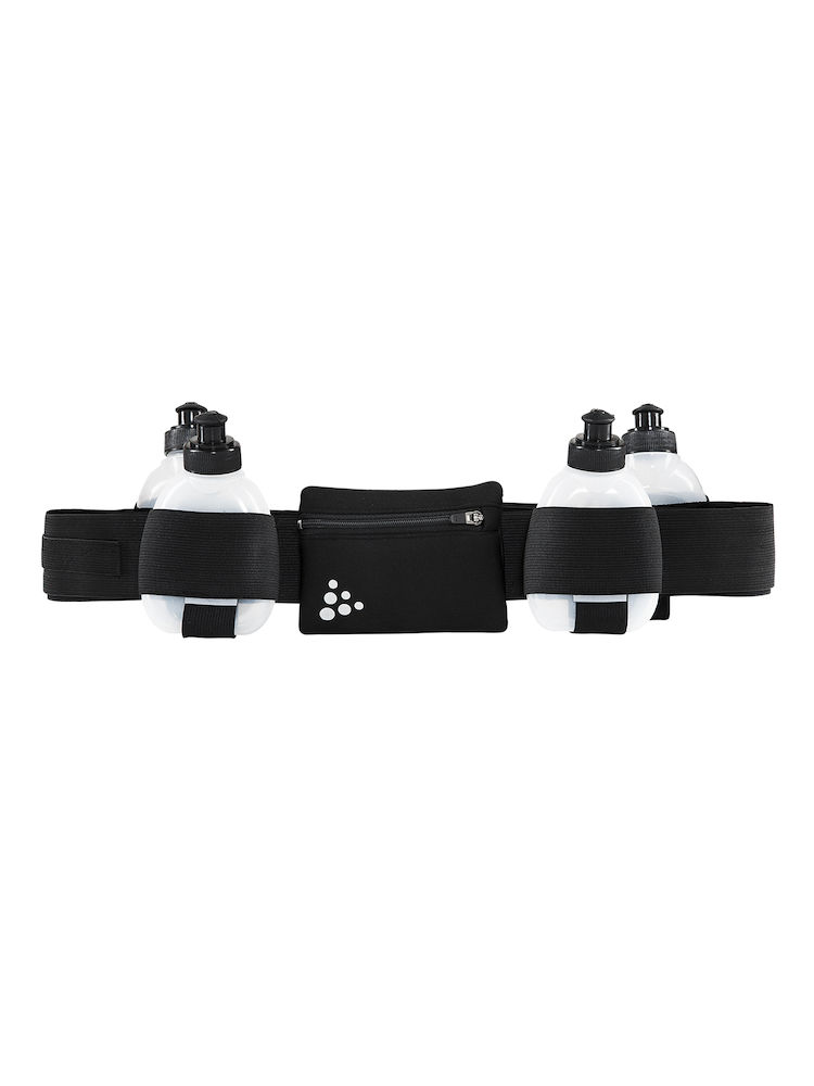 Elastinen ja ergonominen juomavyö neljällä juomapullolla. Mukana irrotettava vetoketjutasku avaimille/puhelimelle sekä taskut energiapatukoille.