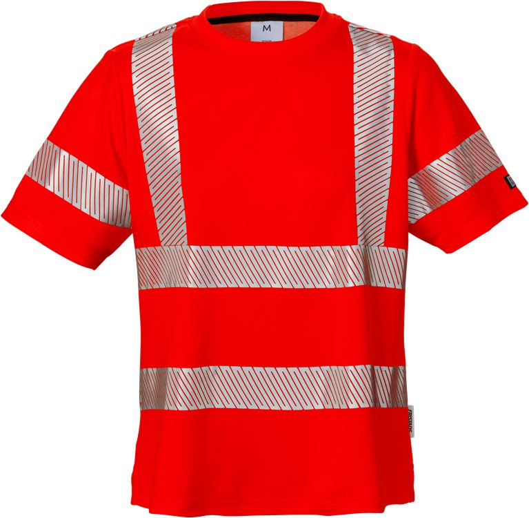 Pyöreä pääntie / Raidallinen siirtokuvaheijastin / Sivuhalkiot / Hyväksytty standardin EN 13758-2 UPF 40+ UV-suoja ja EN ISO 20471 luokka 2 mukaisesti / ÖKO-TEX® -sertifioitu.