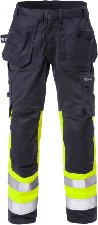 Joustava kangas / Likaa, öljyä ja vettä hylkivä / Kaksi etutaskua / Kaksi CORDURA®-vahvistettua vapaasti riippuvaa taskua, toisessa kolme pienempää taskua ja työkalulenkki, toisessa yksi lisätasku / Kaksi CORDURA®-vahvistettua takataskua, toisessa läppä ja piilopainonappikiinnitys / Kaksoistikattu haarasauma / Vasaralenkki / CORDURA®-vahvistettu mittatasku, jossa kynätasku, nappi ja lenkki puukolle / Reisitasku, jossa läppä ja piilopainonappikiinnitys, puhelintasku, jossa läppä ja tarrakiinnitys, D-rengas läpän alla / CORDURA®-vahvistetut sisäpuolelta avautuvat polvitaskut / Polvitaskuissa polvisuojille korkeudensäätö / CORDURA®-vahvistetut lahkeensuut / Heijastinnauhassa vahvistettu kaksoistikkaus / Hyväksytty standardin EN 14404 mukaisesti yhdessä polvisuojien 124292 kanssa, EN 61482-1-2 luokka 1, EN 61482-1-1 EBT: 10,3 cal/cm2 HAF:80% (ks. valokaaritaulukosta standardin EN 61482-1-2 lk 2 mukaan sertifioidut vaateyhdistelmät ja open arc -sertifioidut vaatteet standardin EN 61482-1-1 mukaisesti), EN ISO 11612 A1 B1 C1 F1, EN 1149-5 ja EN ISO 20471 luokka 2 / Kangas on hyväksytty standardin EN 13034 mukaisesti / Testattu teollisen pesustandardin ISO 15797 mukaisesti / ÖKO-TEX® -sertifioitu.