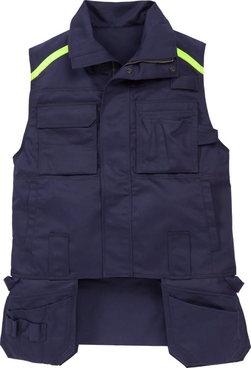 Palosuojattu liivi vahvasta ja kestävästä materiaalista. Monta taskua. Kestää vähintään 50 pesukertaa teollisessa pesussa.