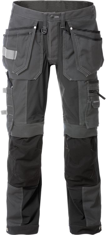 4-suuntaan joustavat stretch-paneelit edessä, takana ja reisissä / Kaksi CORDURA®-vahvistettua riipputaskua, toisessa kolme pienempää taskua ja työkalulenkit, toisessa yksi lisätasku ja työkalulenkit / Kaksi etutaskua leventävillä laskoksilla / Kaksi sivutaskua, toisessa vetoketju / D-rengas riipputaskun alla / Kaksi CORDURA®-vahvistettua takataskua, joissa irrallinen alaosa, toisessa läppä ja tarrakiinnitys / Tuplavahvistettu haarasauma / Vasaralenkki / Mittatasku, jossa työkalutasku, kynätasku, nappi ja lenkki puukolle / Monitoimireisitasku, jossa puhelintasku, henkilökorttitasku ja vettähylkivä vetoketjutasku / Taskut vahvistettu metalliniiteillä kulumiselle altistuvissa kohdissa / Muotoillut polvet / CORDURA®-vahvistetuissa polvitaskuissa on ylhäällä, ulkopuolelta aukko polvisuojille / Polvitaskuissa säätö polvisuojille / Heijastintereet lahkeissa takana / CORDURA®-vahvistetut lahkeensuut, säädettävissä painonapilla / Kontrastisaumat / Standardin EN 14404 mukainen yhdessä polvisuojien 124292 kanssa / ÖKO-TEX®-sertifioitu.