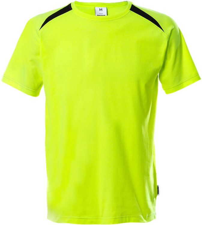 Joustavasta materiaalista valmistettu t-paita, jonka keltaiset hartiat parantavat näkyvyyttä.