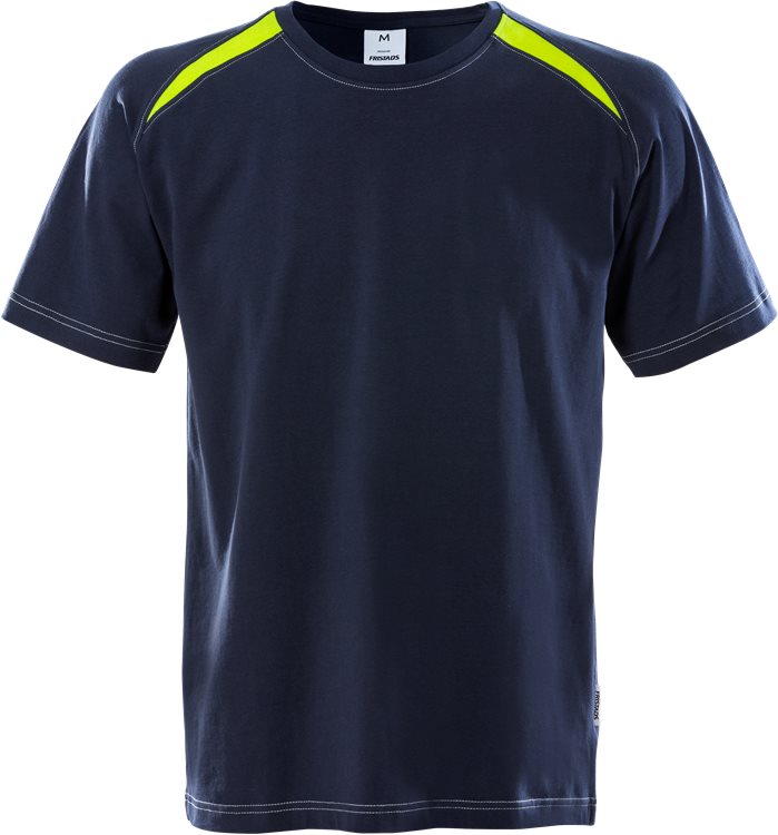 Joustavasta materiaalista valmistettu t-paita, jonka keltaiset hartiat parantavat näkyvyyttä. Materiaali: 95 % puuvilla, 5 % elastaani. Väri: Tummansininen (540)