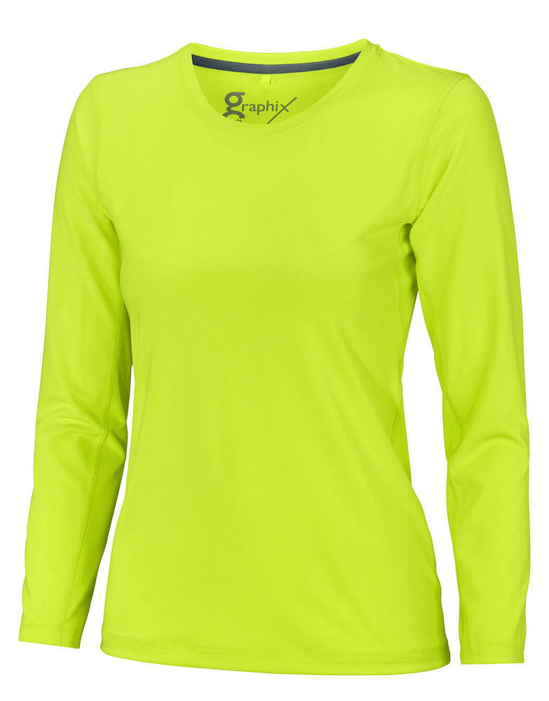 Ihastu Graphixin sporttisiin ja värikkäisiin vaatteisiin! Amadora on joustava ja miellyttävä naisten pitkähihainen t-paita. Värit: neonkeltainen (239), neonpinkki (439), sininen (739), musta (990)