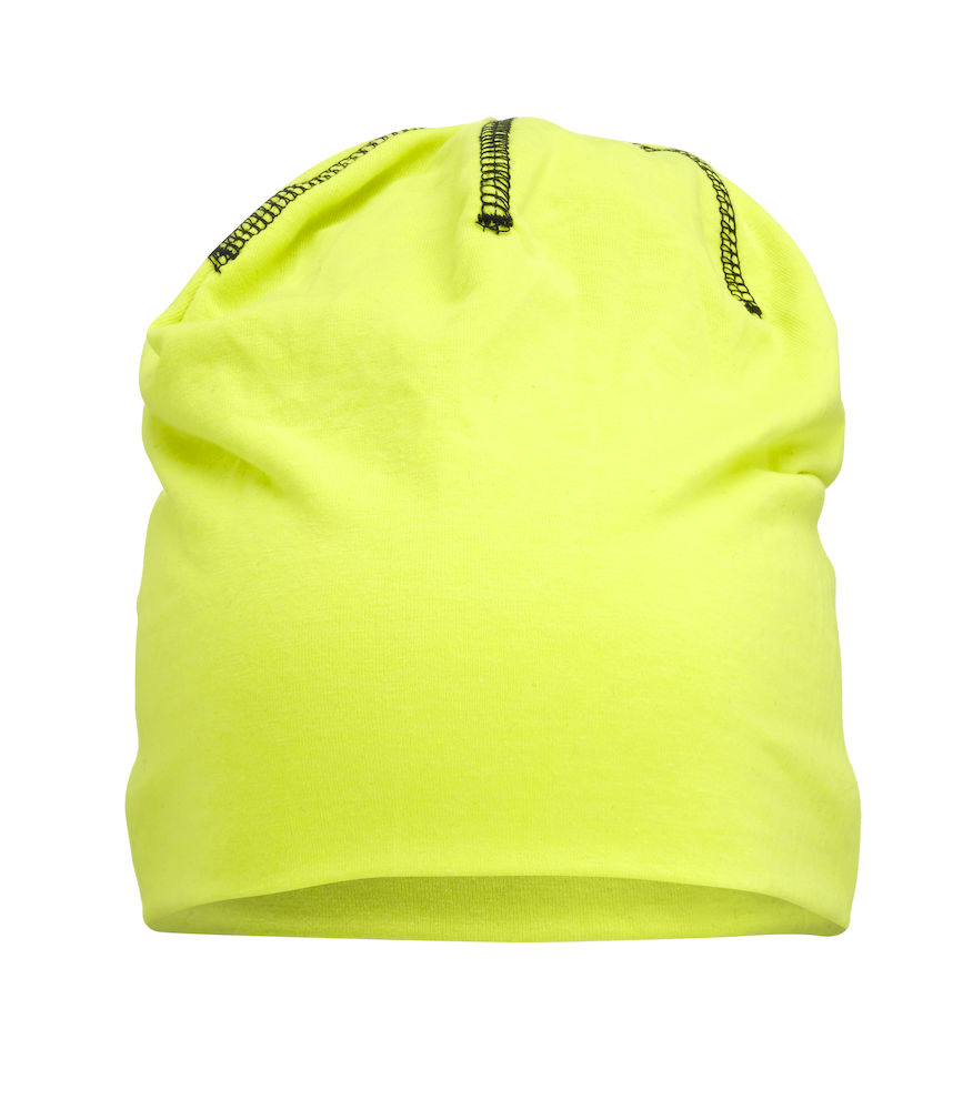 Sporttinen pipo ohuesta jersey-kankaasta koristetikkauksin. Tasainen neulos helpottaa merkkausta.
