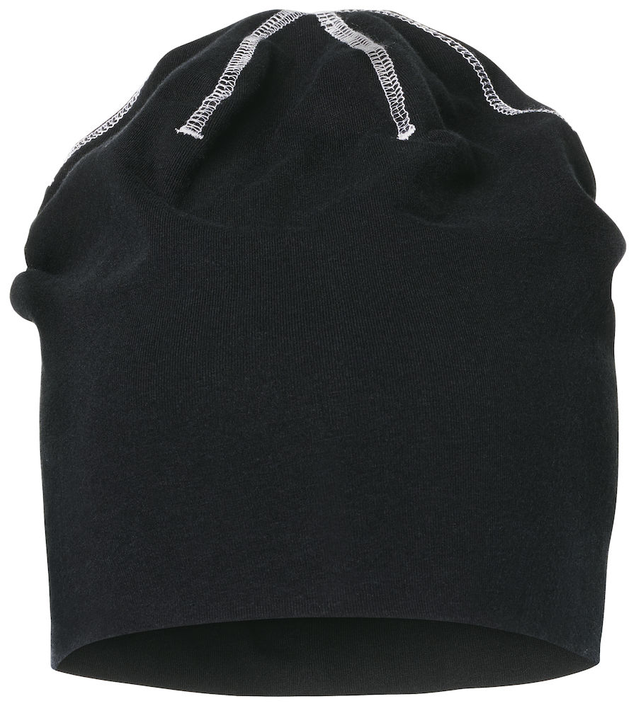 Sporttinen pipo ohuesta jersey-kankaasta koristetikkauksin. Tasainen neulos helpottaa merkkausta.
