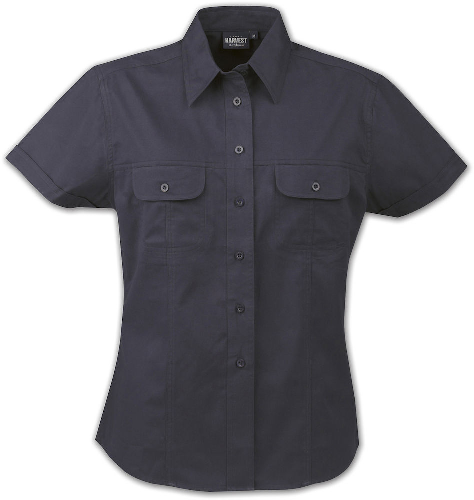 Naisten malli Hillsboro-paidasta. Lyhythihainen twillpaita, jossa läpälliset rintataskut. Taskuissa erillinen tila kynille. Sävy sävyyn napit. Hiottu pinta antaa tuotteelle pehmeyttä.