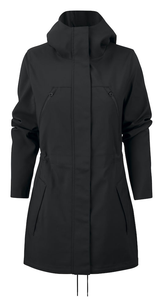 Hupullinen city-takki. Säädettävä kiristysnauha vyötärön sisäpuolella ja helmassa. Povitasku sekä edessä olevat taskut ovat vetoketjulliset. Mattamustat vetoketjut. Takissa vettä hylkivä pintamateriaali. Upeat, laadukkaasti viimeistellyt yksityiskohdat.