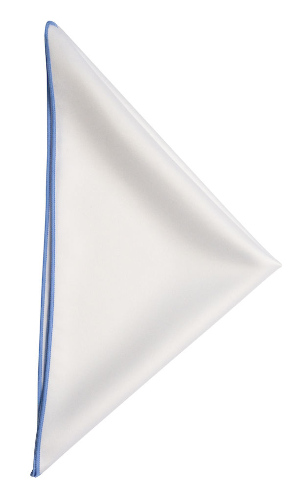 Teimme tähän puhtaanvalkoiseen taskuliinaan reunat useassa eri värissä. Voit yhdistää taskuliinan ja kalvosinnapit asuusi tai yrityksesi väreihin.
