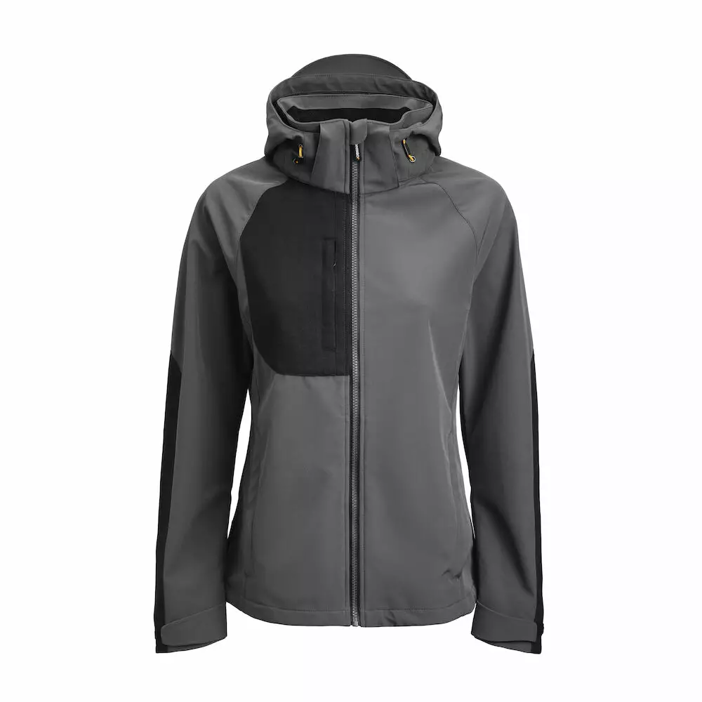 Naisten softshell-takki, jossa vahvistettua materiaalia / kontrastivärit hihoissa ja rintataskussa. Irrotettava huppu, joustava kiristysnauha. Vetoketjulliset etu- ja rintatasku edessä yläoikealla. Sisäpuolen "birdeye-trikoota" siirtää hyvin kosteutta. Vetoketju edessä ja delrintyyppinen vettähylkivä vetoketjuteippaus. Takkia voidaan säätää alhaalla olevalla kiristysnauhalla. Taivutetut hihat. Tarranauhoin säädettävät hihansuut.