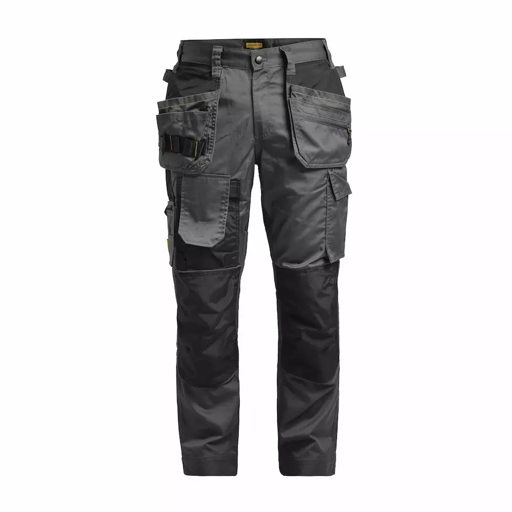 Teretaskut takana. Reisitasku lisälokerolla ja tarranauhalla kiinnitettävällä läpällä. Tuumamittatasku puukkopidikkeellä. Reisitasku puukkokoteloille. Vahvistetut polvisuojataskut, joissa on kaksi korkeutta polvisuojille. Housunlahkeita voidaan pidentää 5 cm lahkeensuiden taitoksesta. Sertifioitu standardien EN 14404 2004 ja A1:2010, tyyppi 2, taso 1 mukaisesti yhdessä Jobmanin polvisuojien 9943, 9944 ja 9945 kanssa.