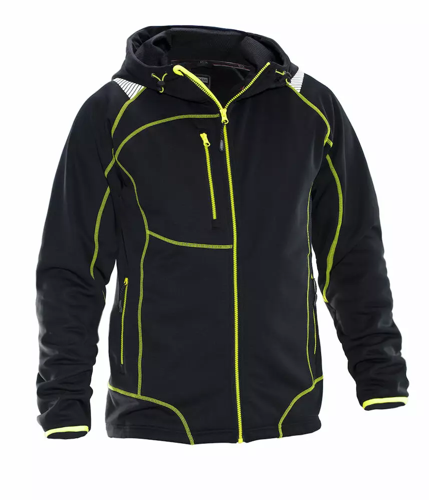 Huppari joustavaa polyesteriä, jossa fleece-sisäpinta. Fluoresoivat saumat ja