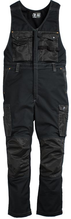 lokerotasku, vasemmalla kannellinen reisitasku, jonka päällä puhelin-ja henkilökorttitasku (pysty- /vaakakortille), kaksi takataskua, muotoillut polvet ja polvisuojataskut korkeuden säätöpalalla sisäpuolella, säädettävä kuminauha takana vyötäröllä, vyönlenkit, selässä joustava resorineulos, etuolalla pidennysvara, lahkeensuussa pidennysvarana 6cm saumavara.
