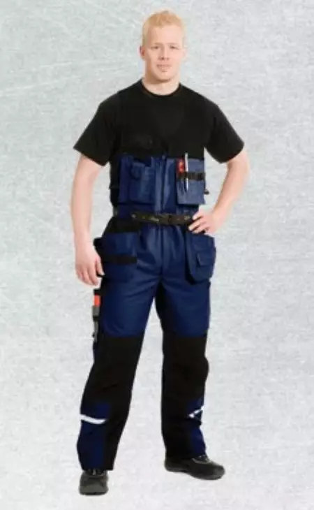 Kestävä rakentajan / remontoijan avosuoja. Kaksisuuntainen vetoketju edessä. Riipputaskut lanteilla edessä. Taskut takana. Taskut vasen ja oikea reisi. Taskut rinnassa. ID-korttitasku rinnassa.... Lue lisää