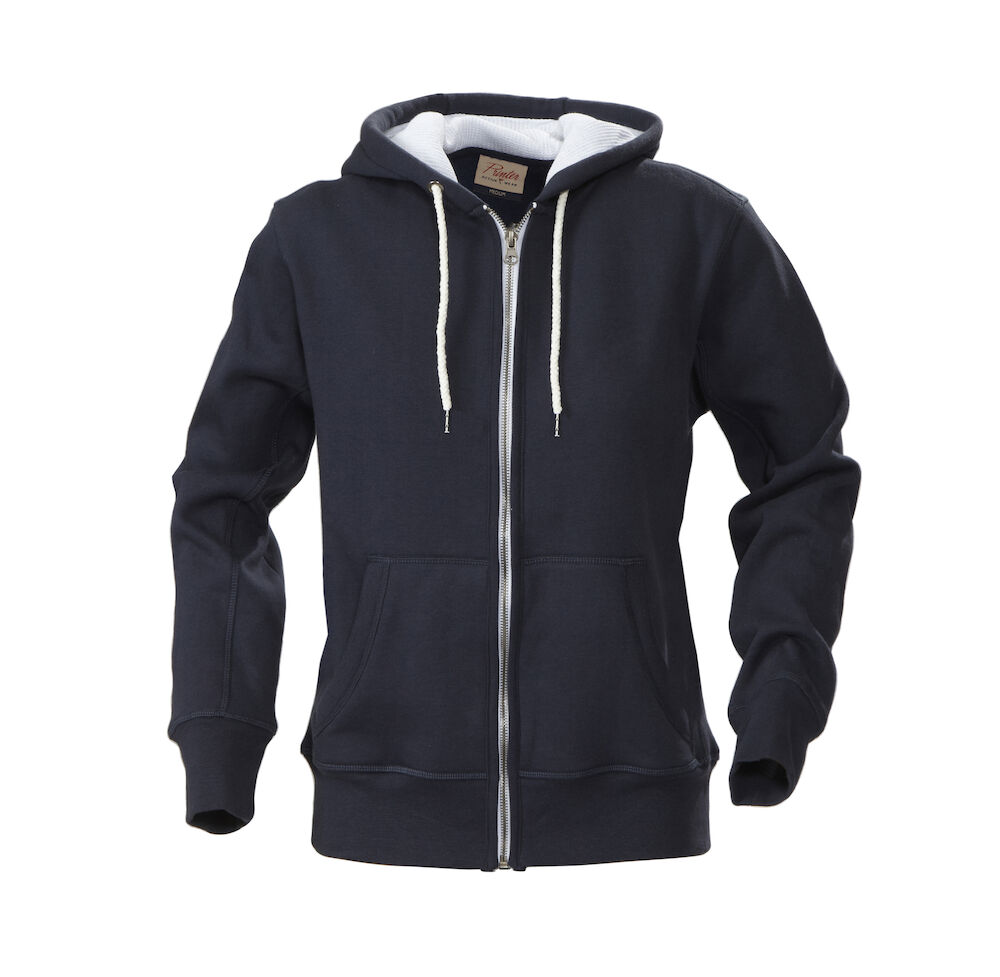Naisten college-takki tukevaa kangasta, harjattu sisäpinta. Hupussa vohvelikangasvuori. Metallivetoketju edessä. Flatlock-tikkaukset.
